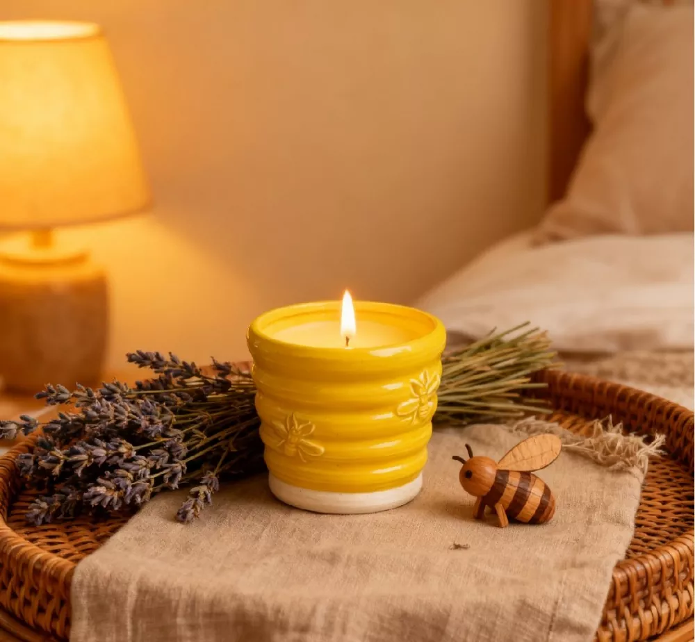 Das Bienenwachs-Keramikkerzenglas von BYF ist eine süße Begegnung zwischen Bienen und Keramik. Wir haben den rundlichen Körper dieses Glases aus weicher, glatter Keramik geformt und ihn mit lebhaften Bienenreliefs und kleinen Blumen verziert – als ob sie gerade Nektar gesammelt hätten und im Kerzenlicht ruhen würden. Wenn die Kerze angezündet wird, dringt der Lichtschein durch die honigartige Glasur und wirft schwankende Schatten an die Wand, und der ganze Raum flüstert ein warmes kleines Gedicht.