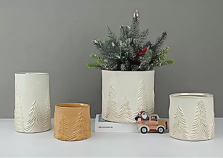 Die geprägte Weihnachtskiefernvase nutzt das klassische Kiefernbaummuster als Hauptdesignelement und steht für Widerstandsfähigkeit und Langlebigkeit, ein bleibendes Thema für den Winter und die Feiertage. Die Prägetechnik erhöht nicht nur die visuelle Tiefe, sondern vermittelt auch ein Gefühl von handwerklicher Wärme und künstlerischem Sammlerwert, der gewöhnliche Plastikdekorationen bei weitem übertrifft. Zu den praktischen Formen gehören außerdem klassische zylindrische, stabile quadratische Sockel und elegante ovale Designs, die unabhängig voneinander als Kunstwerke verwendet werden können oder Pflanzen perfekt beherbergen. Als Teil einer Produktserie können die in verschiedenen Größen und Designs erhältlichen Blumentöpfe frei kombiniert und angeordnet werden (z. B. in Fächerform oder in Reihen), um eine geschichtete und optisch beeindruckende Tischlandschaft zu schaffen.