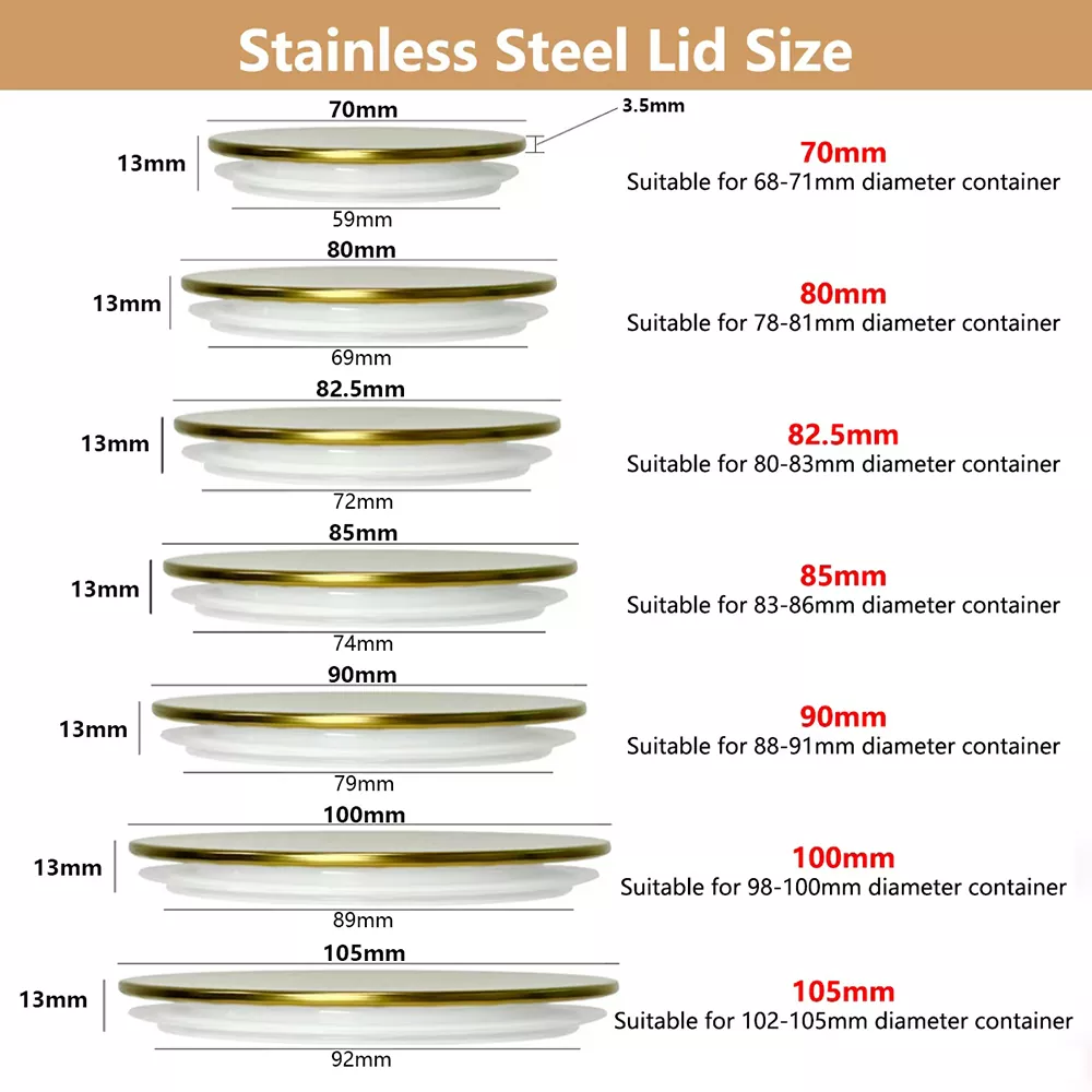 Unser Siebdruck aus rostfreiem Stahlkerzenglas sind in verschiedenen Größen erhältlich, alle mit einer Gesamthöhe von 13 mm. Die spezifischen Abmessungen und kompatiblen Containeröffnungen sind unten dargestellt: